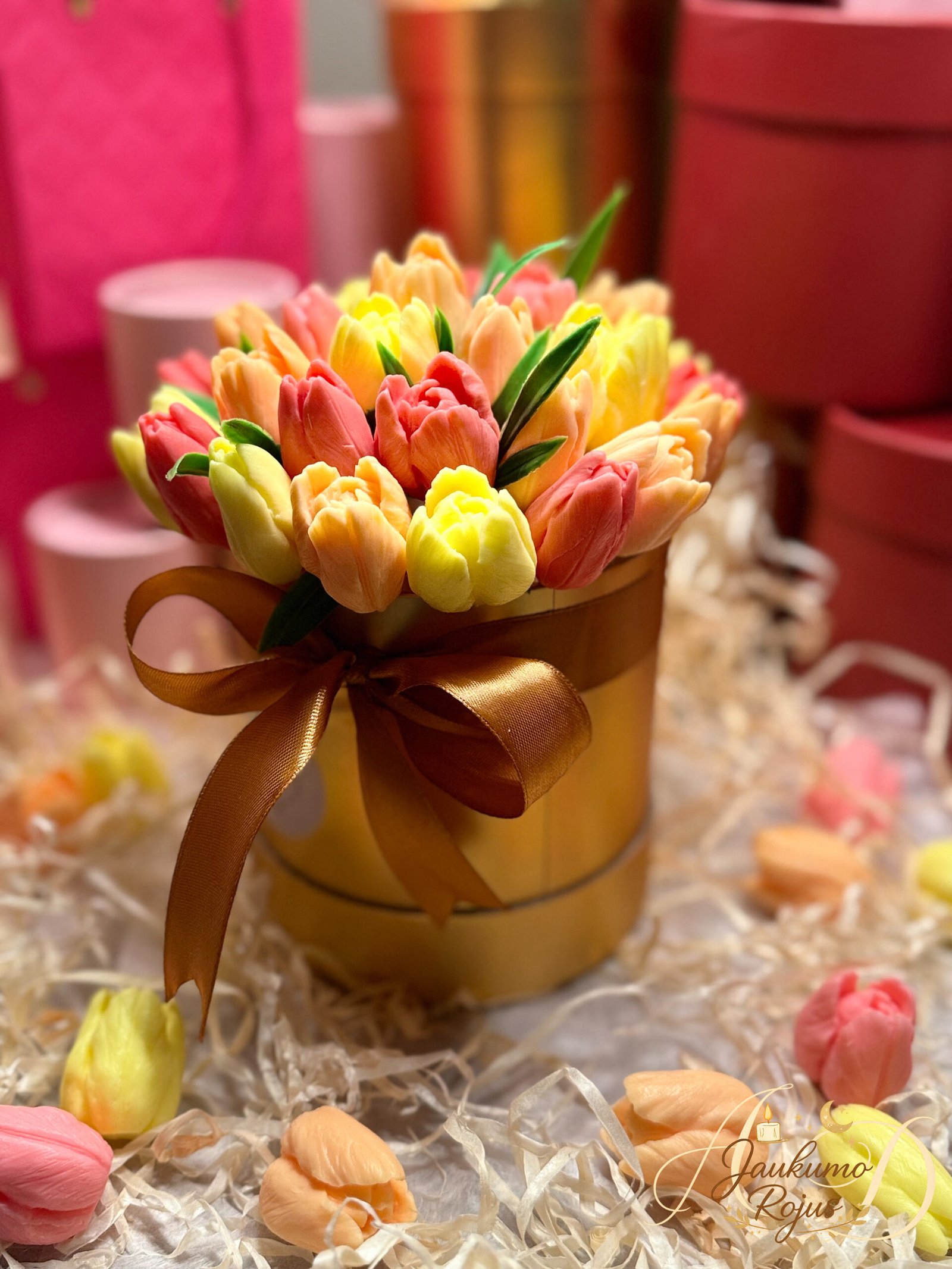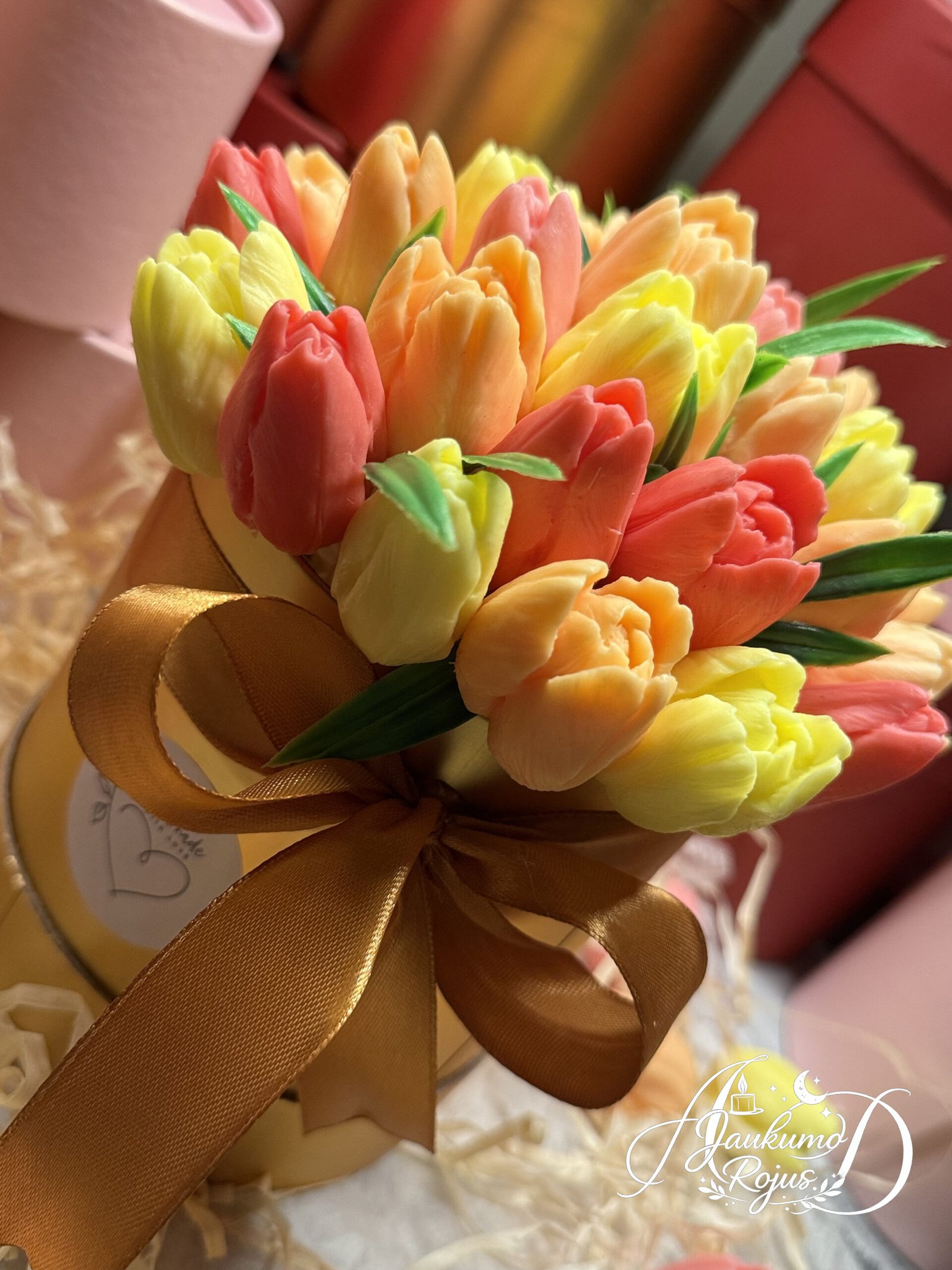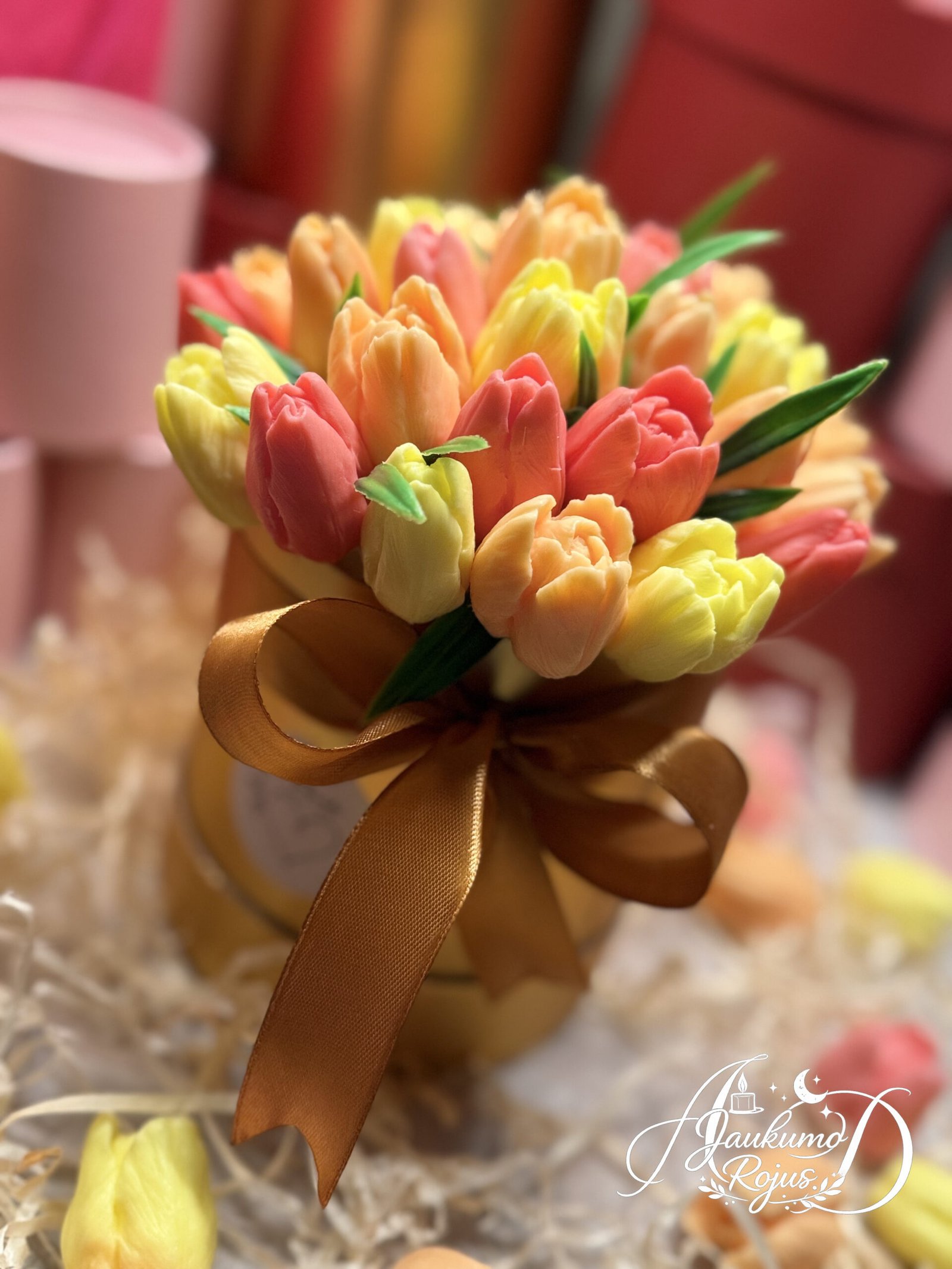 Kai puokštė kaip interjero detalė atsibos, ją galėsite drąsiai panaudoti pagal tiesioginę paskirtį, nes kiekviena tulpė – tai aukštos kokybės, kvepiantis rankų darbo muilas.